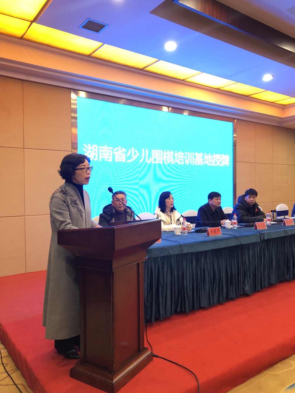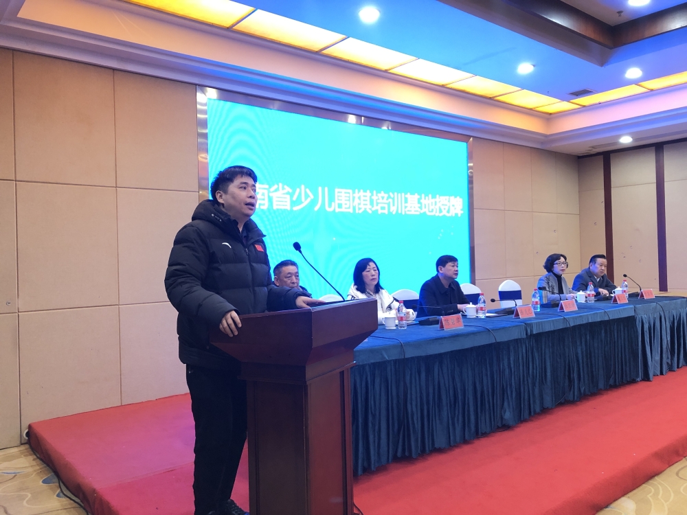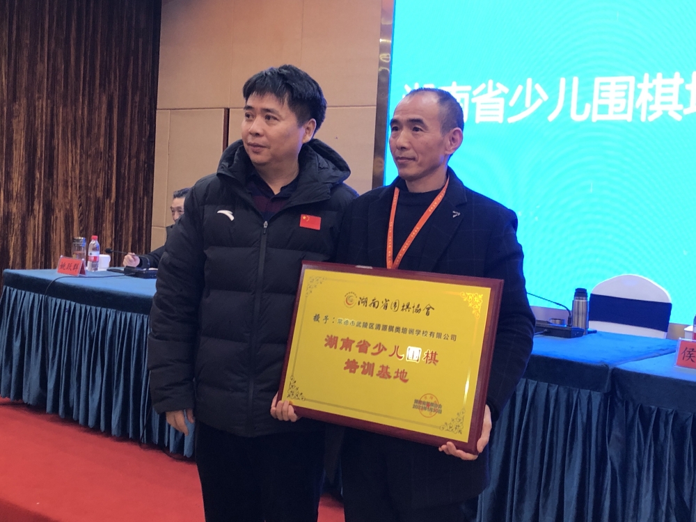 湖南省圍棋協(xié)會(huì)常務(wù)副主席兼秘書(shū)長(zhǎng)杜亞捷先生授“湖南省少兒圍棋培訓(xùn)基地”牌,常德清源棋院熊循先生接牌。